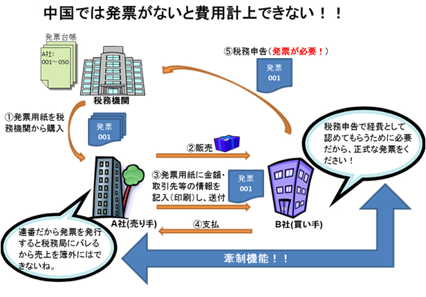 発票は税務上の請求書(Invoice)としての意味合いが強いところが、日本の請求書と大きく異なる点といえます。つまり税務申告の際には税務機関に発票を提出する必要があり、例えば商品の買い手である企業は税務機関に仕入に関する発票を提出しない場合には経費として認められません。これにより買い手は売り手に対して、税務機関が発行した“正式な発票”を要求するというインセンティブが働き、結果として販売側が売上を簿外処理することに対する牽制となるのです。